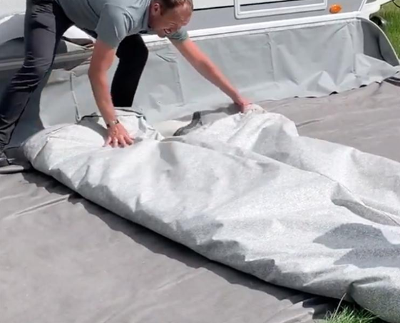 Taget bredes ud på græsset, gerne med indersiden udad, for at beskytte den udvendige belægning.